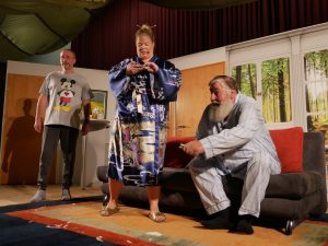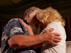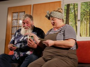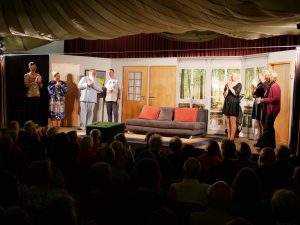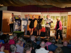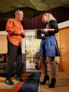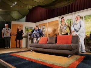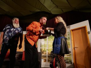 Apropos springen – durchaus sprunghaft präsentierten sich die Schauspieler im Stück „Dat perfekte Dinner“ bei der Partnerwahl. Während Stefan seiner Rosi einen schönen Aufenthalt bei der kranken Schwiegermutter wünscht: „Du moss die doch kümmern uüm diene Mama, moss se bemuttern, bedochtern, begraben, berosimarien“, durchkreuzen Freud Stefan und Köchin Sophie seinen ursprünglich romantischen Plan.