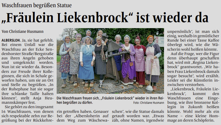 Bei einem Unfall war die Waschfrau an der Ecke Sendenhorster Straße/Bergstraße aus ihren Angeln gehoben und umgeknickt worden. Nun ist sie wieder da. Besonders zur Freude ihrer Kolleginnen, die sich in Schale geworfen haben, um sie an Ort und Stelle zu begrüßen. „