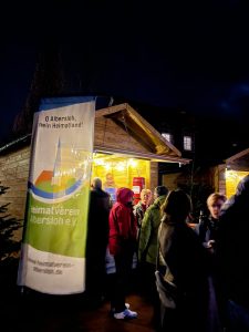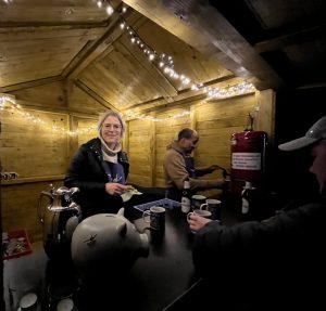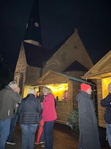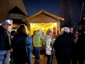 Auf der Wiemhove hatte der Heimatverein die neuen Holzhütten aufgebaut, die von verschiedenen Gruppen, Vereinen, Verbänden auf Anfrage bis zum 4. Januar individuell genutzt werden können. Natürlich sollten die stabilen und mit Lichterketten bestückten Buden entsprechend eingeweiht werden. Was nicht nur die Stimmung, sondern wohl auch den Spendenpegel für die Anschaffung der Teigmaschine weiter ansteigen lässt.